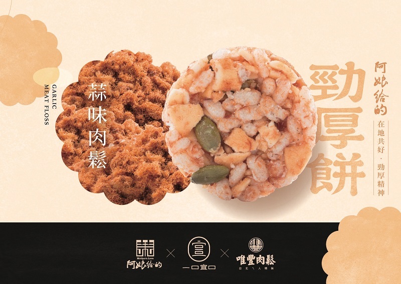 阿娘給的勁厚餅蒜味肉鬆口味,由一口宜口、阿娘給的、唯豐肉鬆三品牌聯名推出。